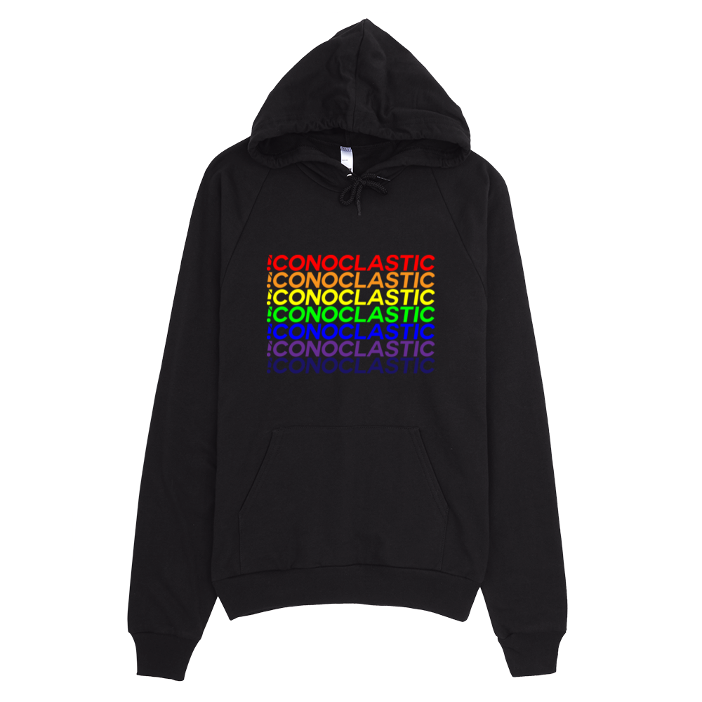 Iconoclastic logo in 7 colors on a fleece pullover hoodie with pouch and drawstrings.
