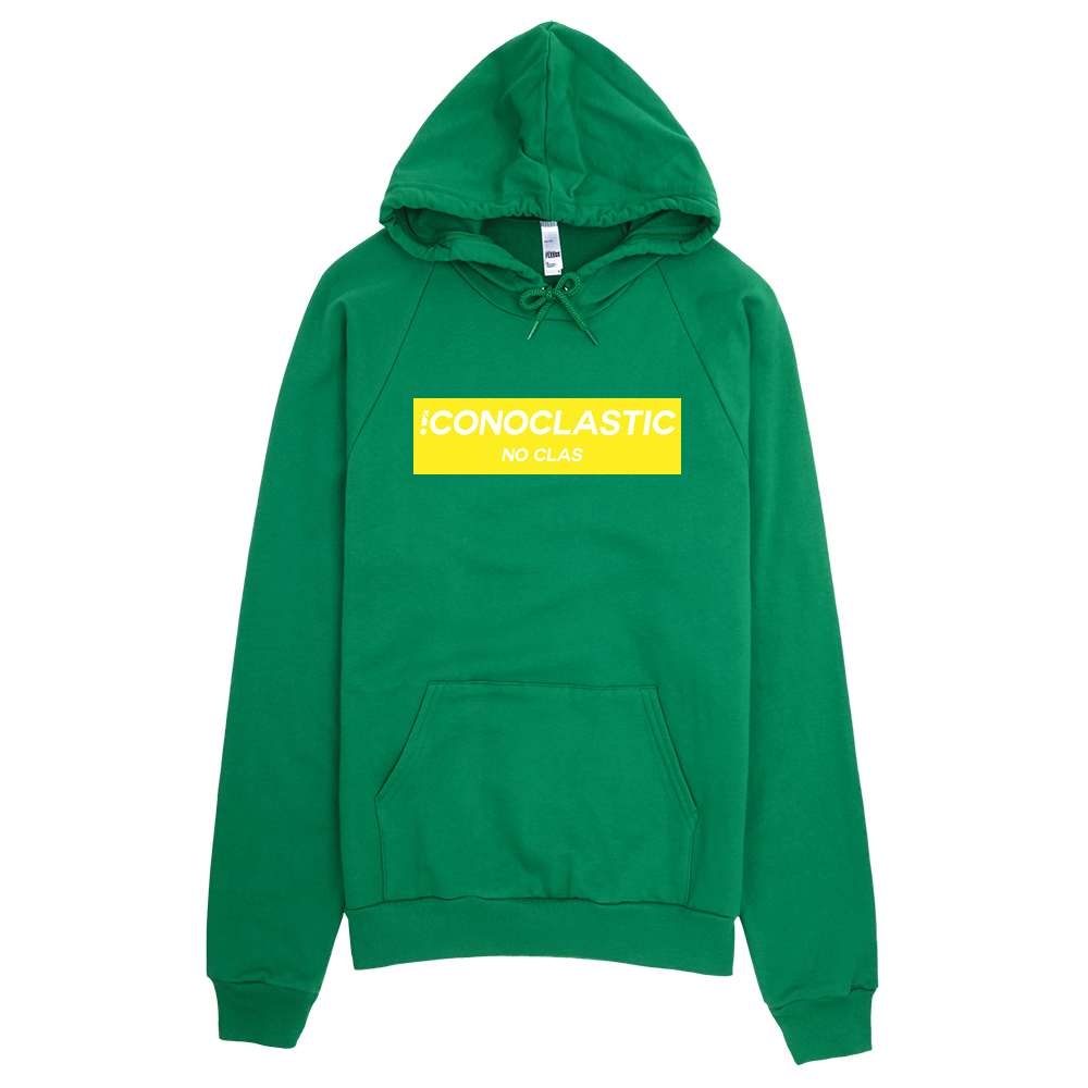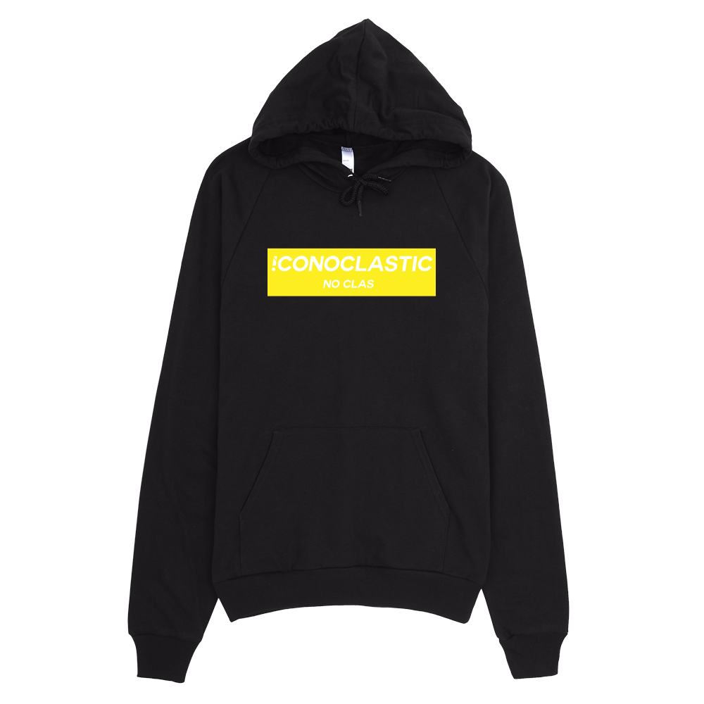 "No Clas" Iconoclastic logo on a fleece pullover hoodie with pouch and drawstrings.
